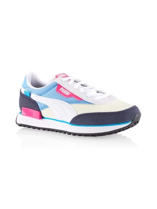 A vintage-inspired look elevates these mixed media sneakers, designed with pop color detailing.