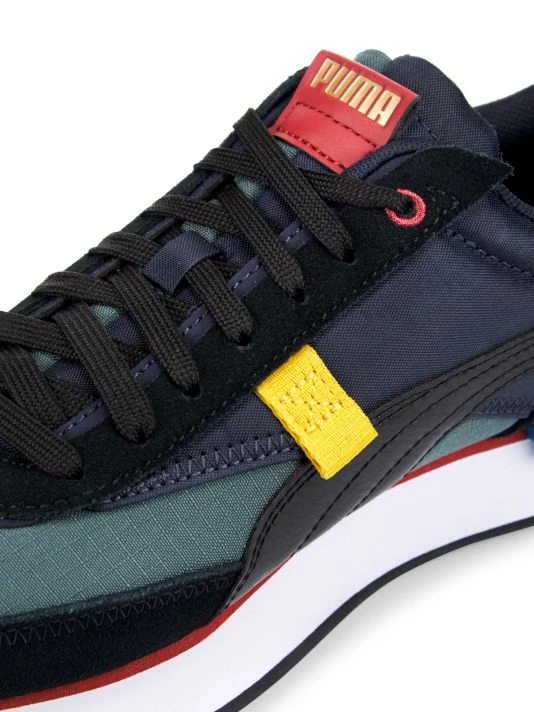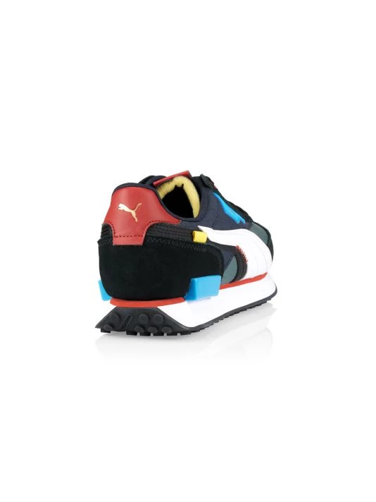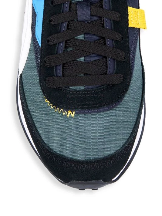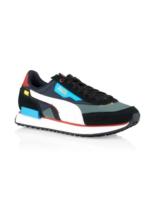 A vintage-inspired look elevates these suede and nylon sneakers, designed with pop color detailing.