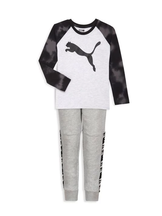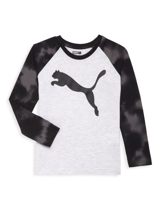 A long-sleeve T-shirt features raglan sleeves in a tie-dye print and the signature big cat logo on the front.