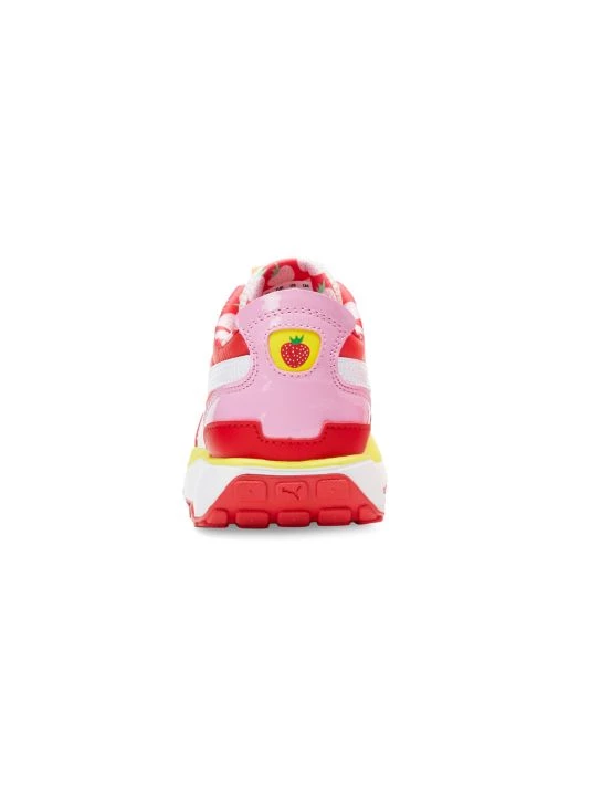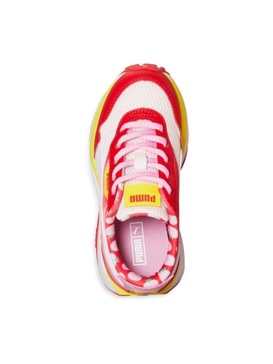 These mesh sneakers feature faux-leather overlays and a strawberry print interior.
