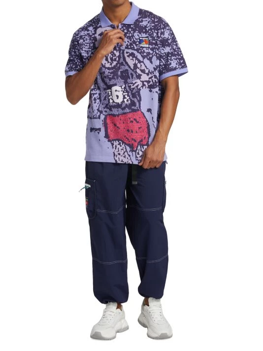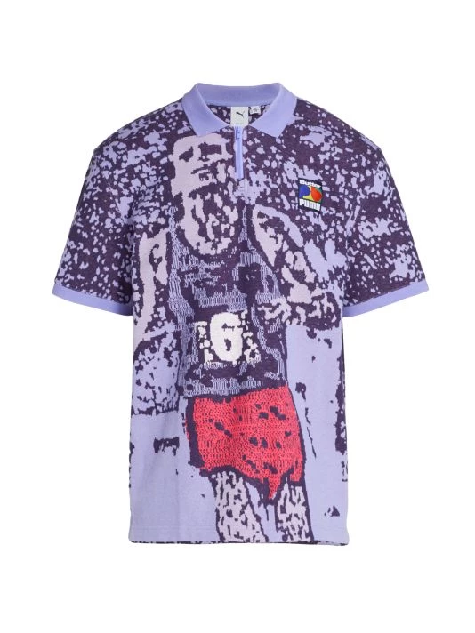 An abstract athletic portrait decorates this cotton short-sleeve shirt.