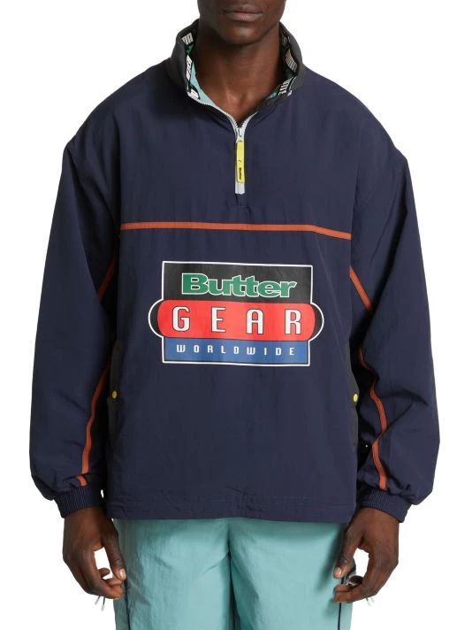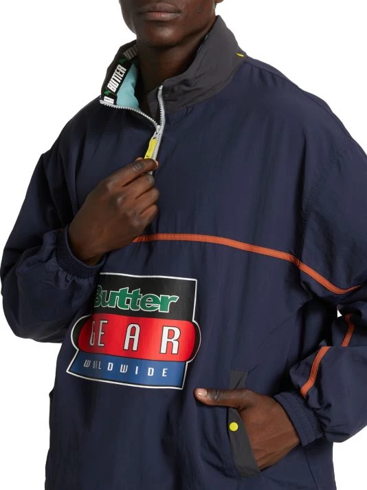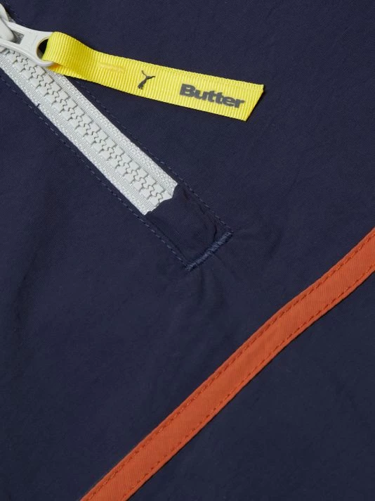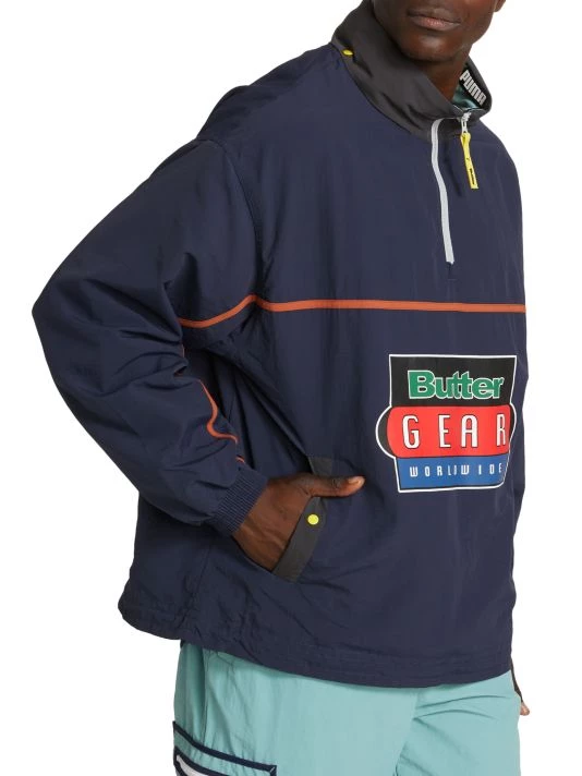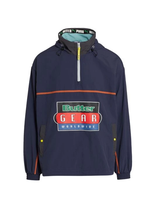 From the Puma X Butter Goods Collaboration. Crafted of lightweight nylon, the Light Pop Over Top features a stowaway drawcord hood, quarter-zip closure, and a snap-button kangaroo pouch allowing for optimal convenience and comfort. Signature Puma X Butter Good logo motifs adorn the inside collar, front, and back of the piece.
