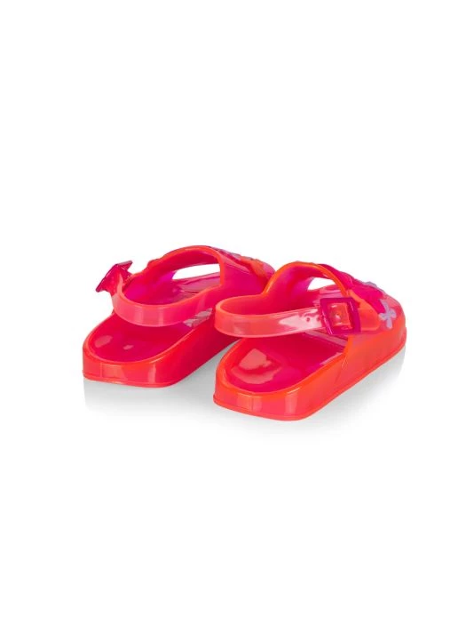Adorable jelly sandals with a butterfly motif and colorblock sole.