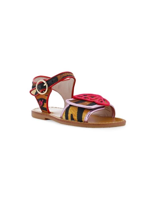 Tiger-stripe straps, iridescent piping, and butterfly wing appliqués define these maximalist Sophia Webster sandals.