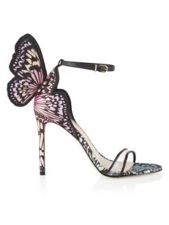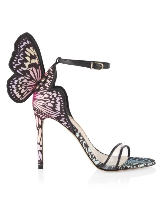 These high-heel sandals are adorned with a butterfly applique at the heel.