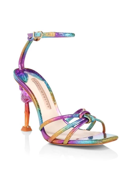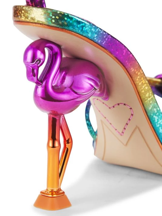 Stunning flamingo heel is original, unique and stunning in vibrant rainbow leather with a modern squared open toe and knot detail.