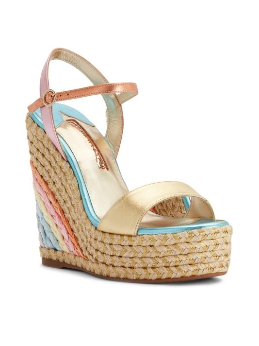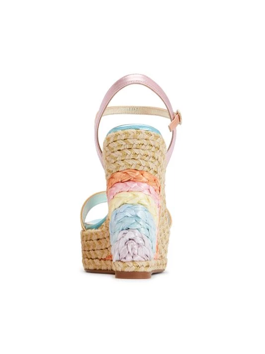 Sophia Webster’s Ines sandals are wrapped in braided raffia evoking a vibrant rainbow. Made in Spain, this whimsical pair is elevated with a wedge and platform.