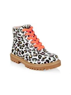 These leopard-print leather combat boots feature rubber soles and butterfly appliqués.
