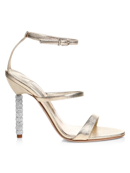 Crafted of rich metallic leather, these strappy sandals are anchored with a stiletto heel of stacked, crystal-embellished baubles.