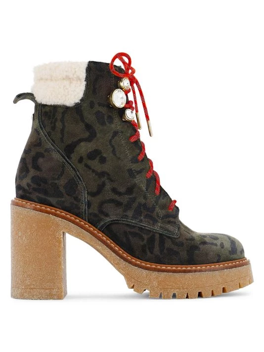 Set atop a platform lug sole and crafted of leopard-print leather with wool and crystal trim, these block-heel combat boots exude an elevated utilitarian allure.